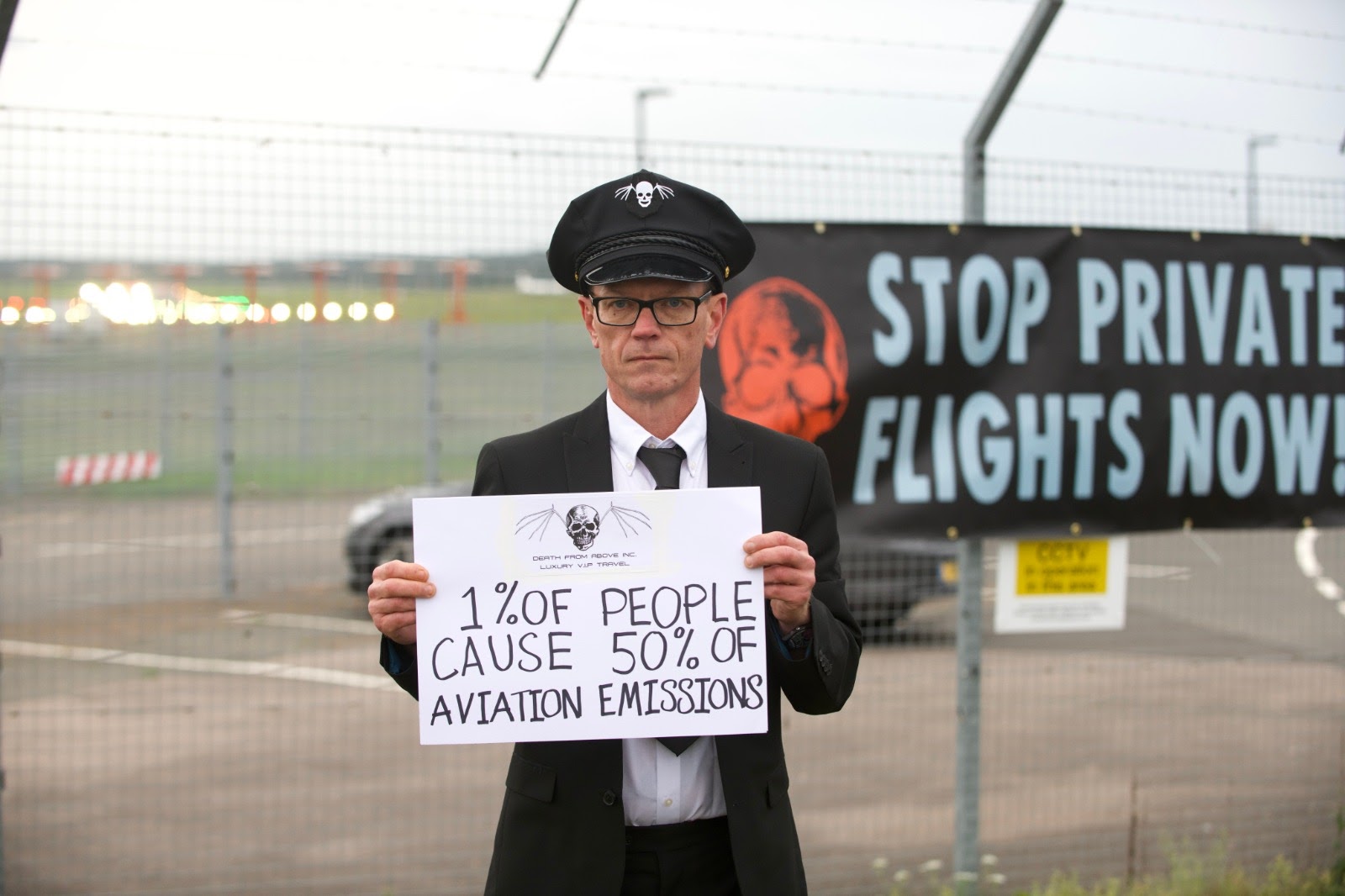 2 OCT | UK An airport for elite private jets was barricaded by rebels locked on to a stretch limousine to highlight the shocking levels of CO2 that private flights emit per passenger.