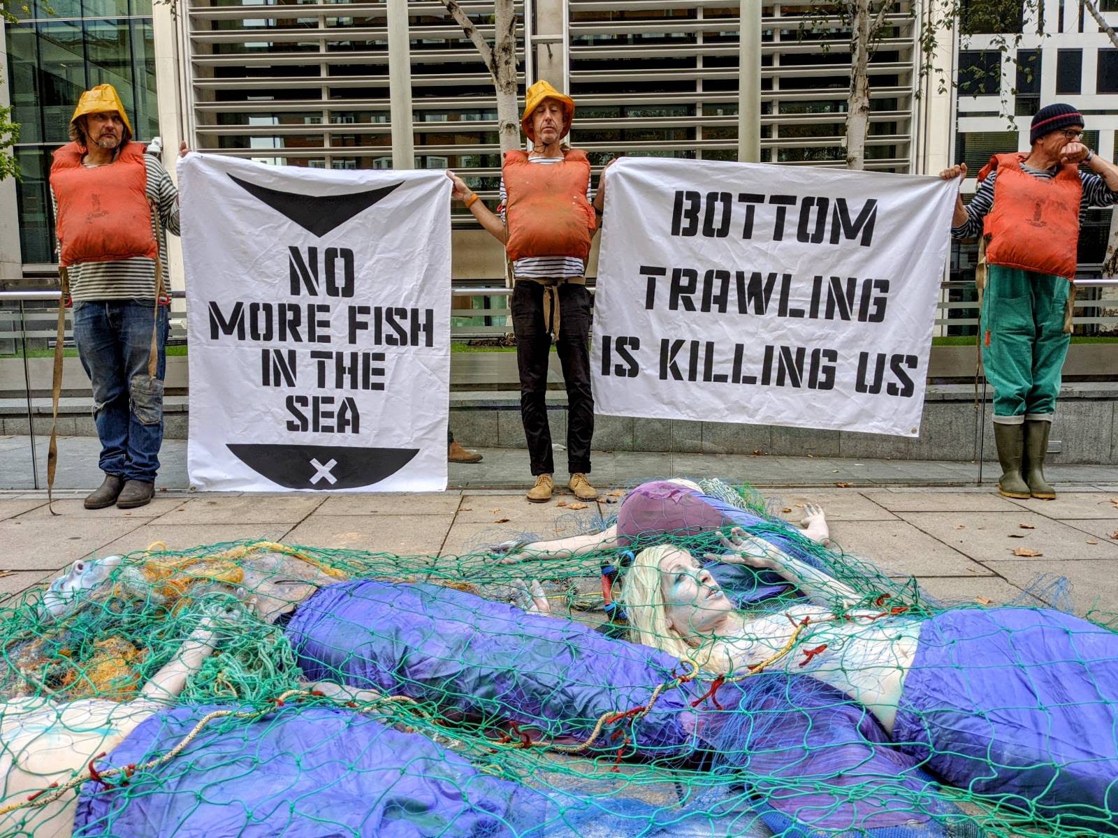 15 SEP | London, UK Mermaids die outside the Environment Ministry, part of an Ocean Rebellion action to ban bottom trawling, a disgustingly destructive form of industrial fishing.