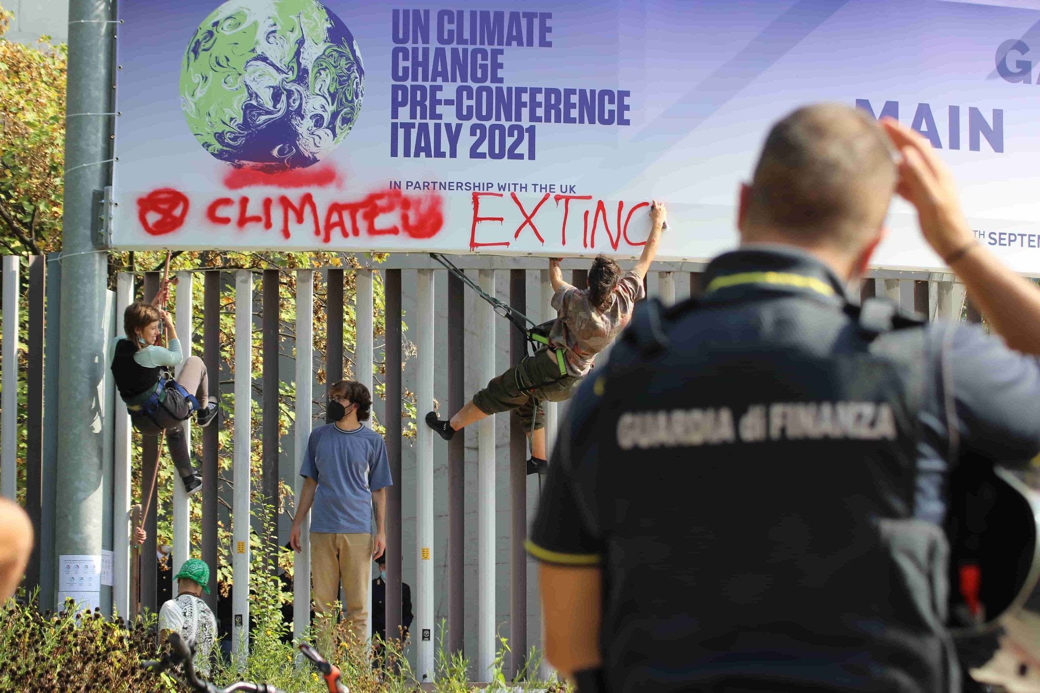 Police look on as rebels scale the gates of the Pre-COP conference in Milan, Italy.