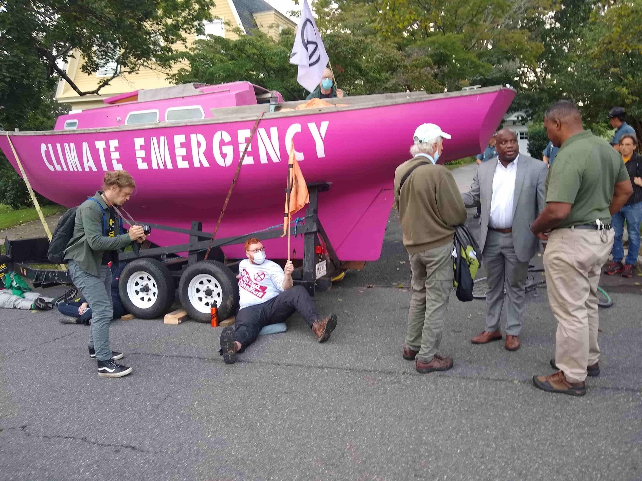 28 SEP | Boston, USA Rebels and Sunrise Movement activists anchor a boat across the Governor of Massachusetts' driveway. Eight arrests were made. Read more here.