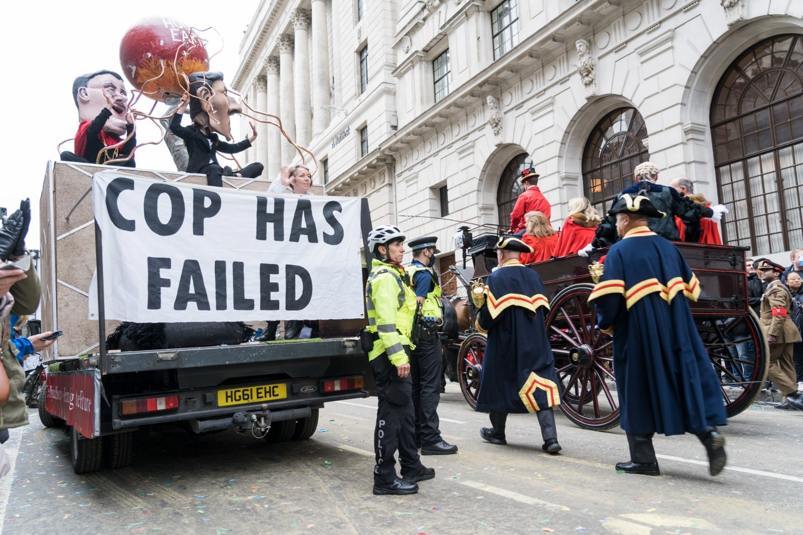 13 NOV | London, UK: Rebels disrupt the Lord Mayor’s parade in the City of London (the heart of UK fossil fuel investment). Police made arrests. Photo: Immo Klink