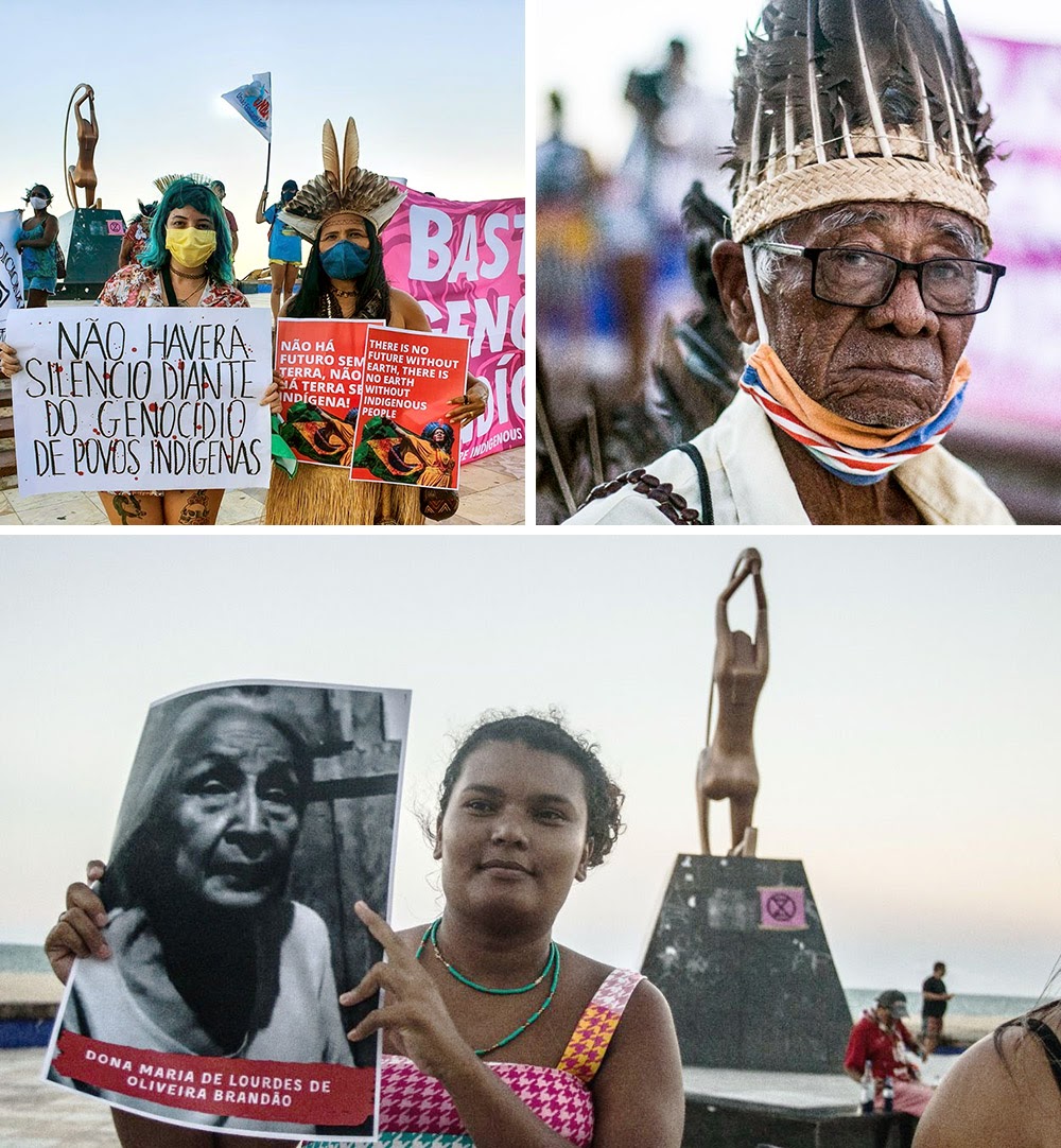 Portraits were held up of indigenous people recently lost to the coronavirus pandemic. Their names were spoken during a vigil where candles were placed around the Iracema Statue.