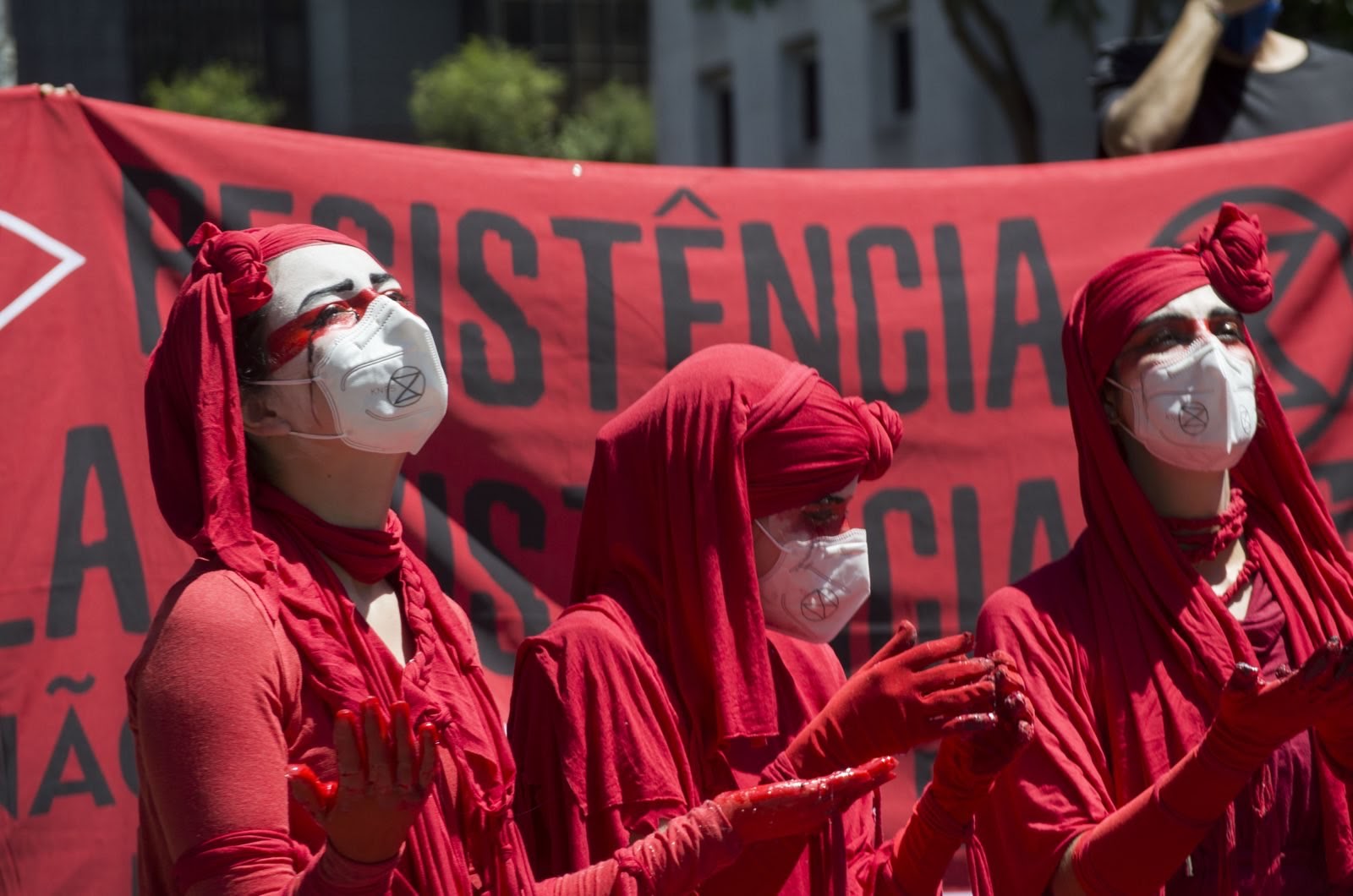 The Red Rebel Carpideiras weep at a funeral for Brazilian biodiversity in Sao Paulo.