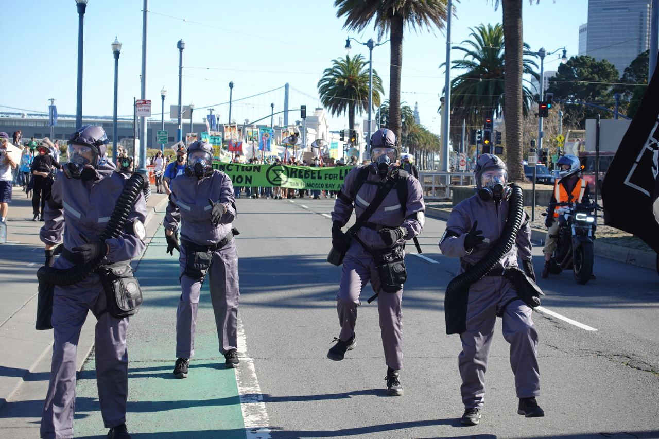 11 NOV | San Francisco Bay, USA: Hundreds of rebels join with other climate justice groups to march through the city. "Xtractors" lead the way - malfunctioning figures who represent the dystopian instability of extractive capitalism. Photo: Lev Schlaffer