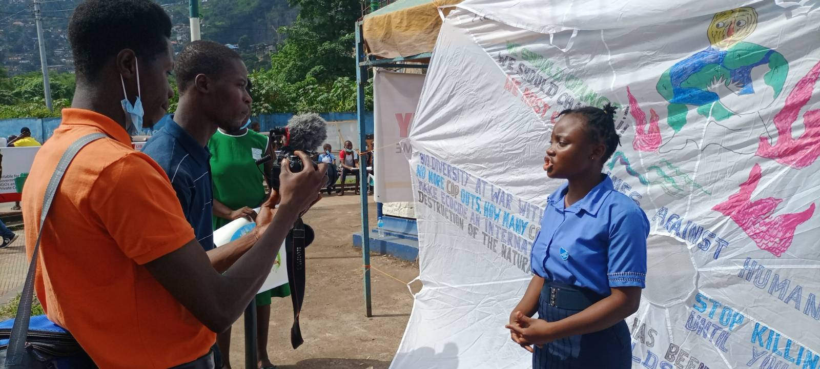 Rebels and local school children sang songs and danced in front of placards and artwork. They also gave interviews to local media.