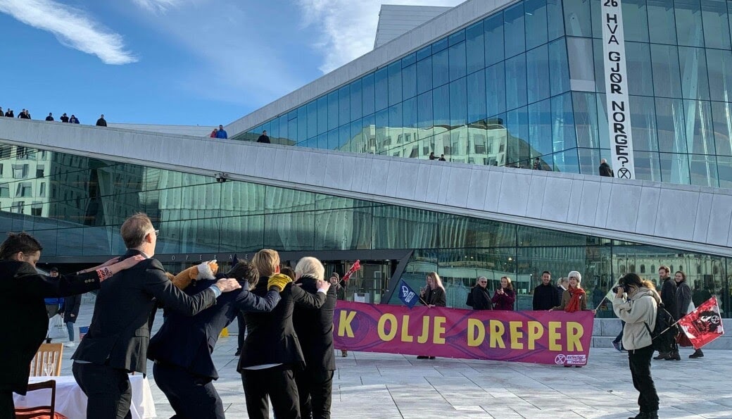 6 NOV | Oslo, Norway: Rebels dressed as delegates play party games rather than agree on a proper climate agreement. Banners unfurled down the opera house as part of the action.