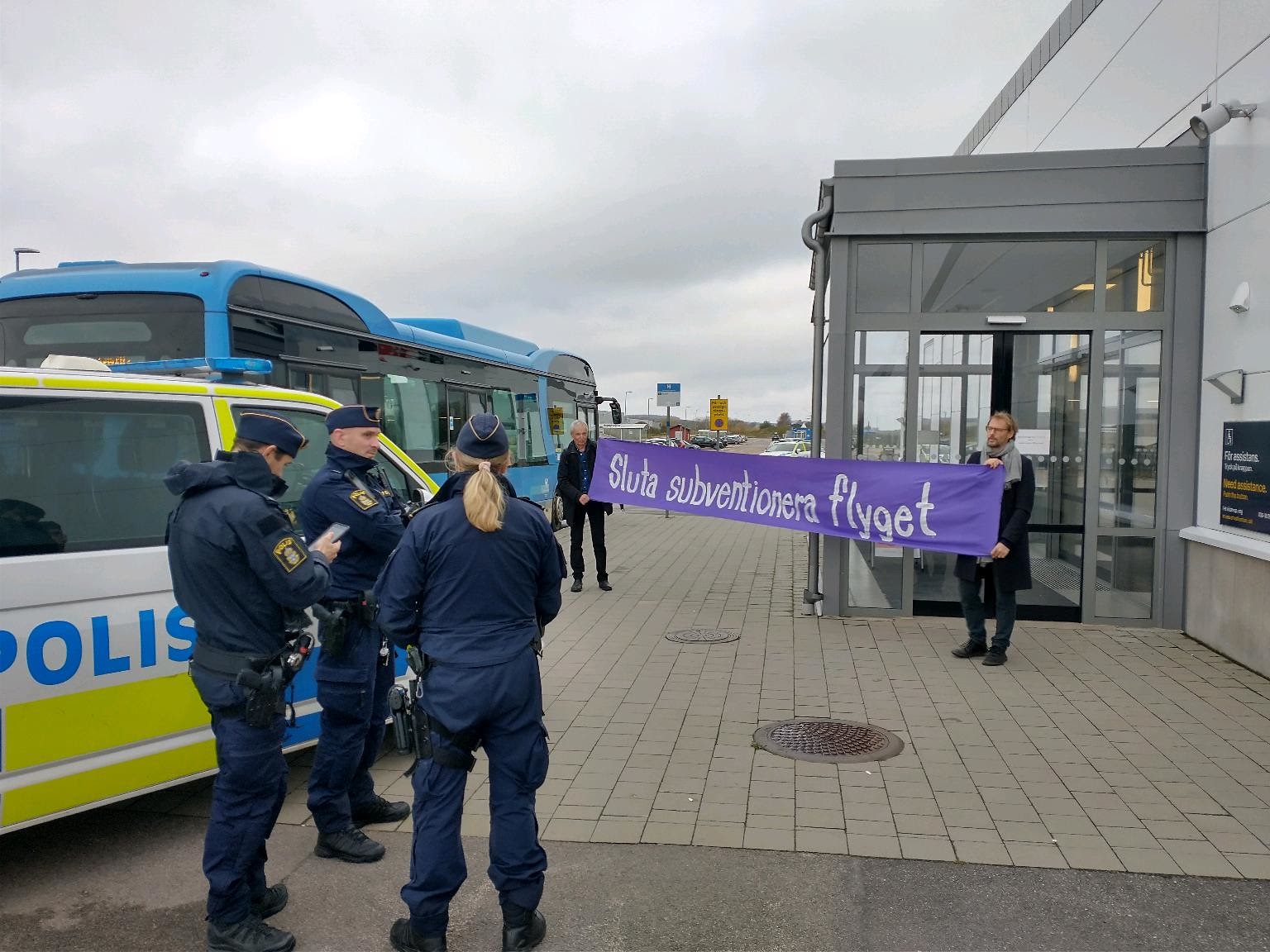 Rebels outside Halmstad airport. The banner: ‘Stop subsidizing flying’.