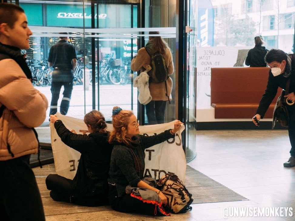 Activists blockade the lobby of Total’s Scandinavian headquarters.