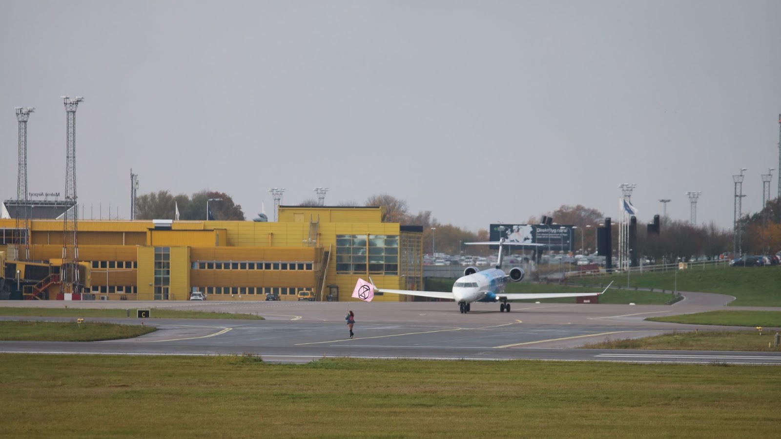 A rebel at Malmö airport stands in the runway to stop a flight.