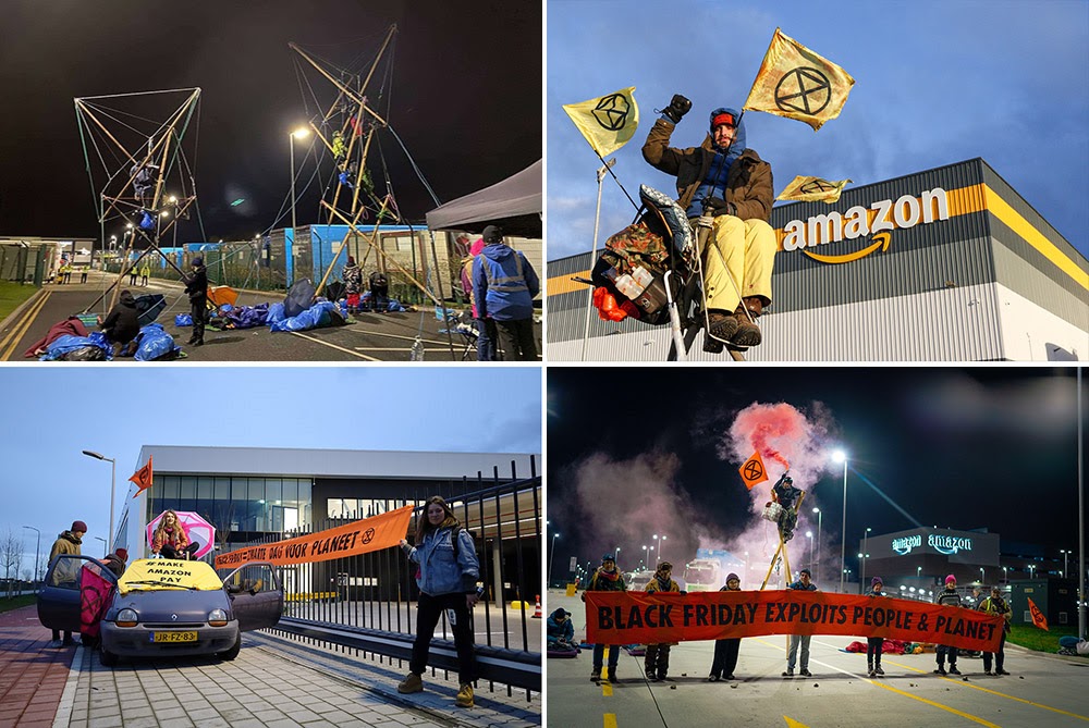 26 NOV | UK, Netherlands, Germany: To mark Black Friday, rebels blockaded 15 Amazon fulfilment centres across Europe, the vast majority of those in the UK. Amazon was targeted because of the major role it plays in driving overconsumption, exploiting workers, and more. Photos: Alex Street (top right), Yaz Ashmawi (bottom right)