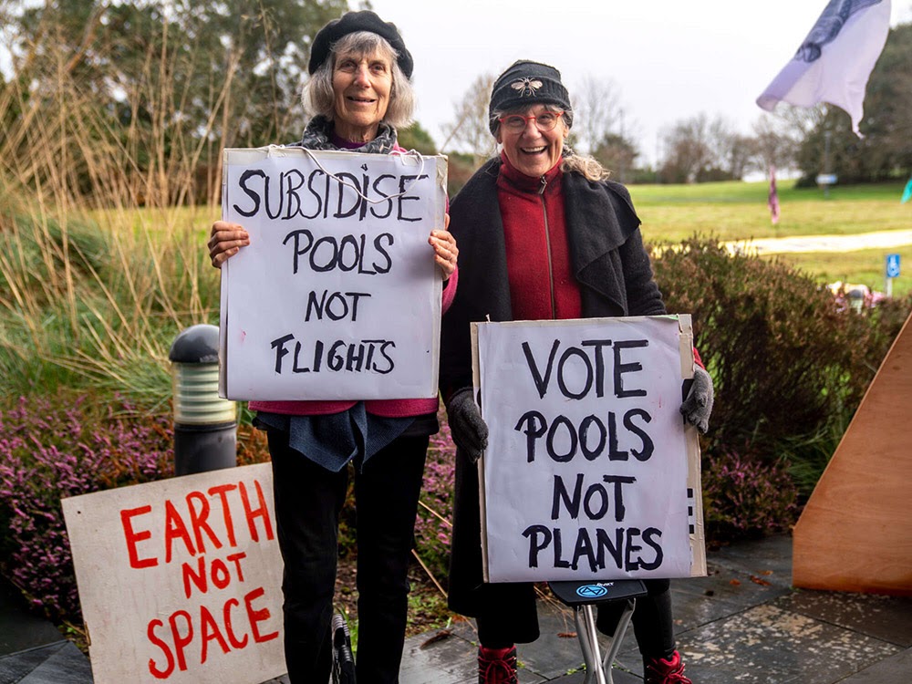 30 NOV | Truro, UK. Cornish rebels protested Cornwall Council’s plan to subsidise internal flights to Newquay Airport instead of 5 community leisure centres and their swimming pools which are likely to close because of pandemic-induced financial problems. The ‘Earth not Space’ placard refers to Richard Branson’s intention to turn Newquay Airport into a spaceport. Photo: Ilya Fisher