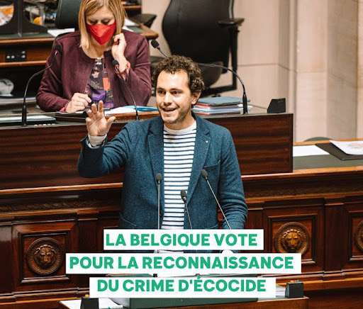 3 DEC | Brussels, Belgium. In a landmark event the Belgian parliament voted by a huge majority (96 to 39) to recognise Ecocide as an international crime. The resolution - proposed by a Green member of parliament (above) - calls on the Belgian government to initiate a treaty of countries willing to prosecute ecocide and to propose an amendment to the Rome Statute of the International Criminal Court of The Hague to include the new crime.