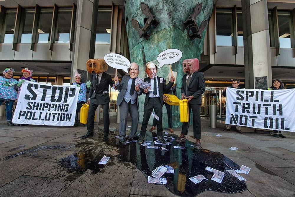 22 NOV | London, UK. Ocean Rebellion took action at the headquarters of the International Maritime Organisation (IMO) as delegates arrived for a Marine Environment Protection Committee meeting. 'Oil heads' representing oil industry lobbyists vomited ‘oil’ and threw ‘dirty money’ outside the entrance.