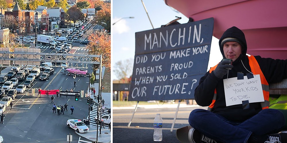 19 NOV | Washington DC, USA. That pink boat keeps getting in the way! Rebels blocked a main highway into the centre of the US capital “because the government is blocking climate progress”. The placard in the photo above refers to Joe Manchin, the Democratic senator from West Virginia who has millions of dollars invested in the coal industry and who has blocked real progress on Biden’s climate plans.