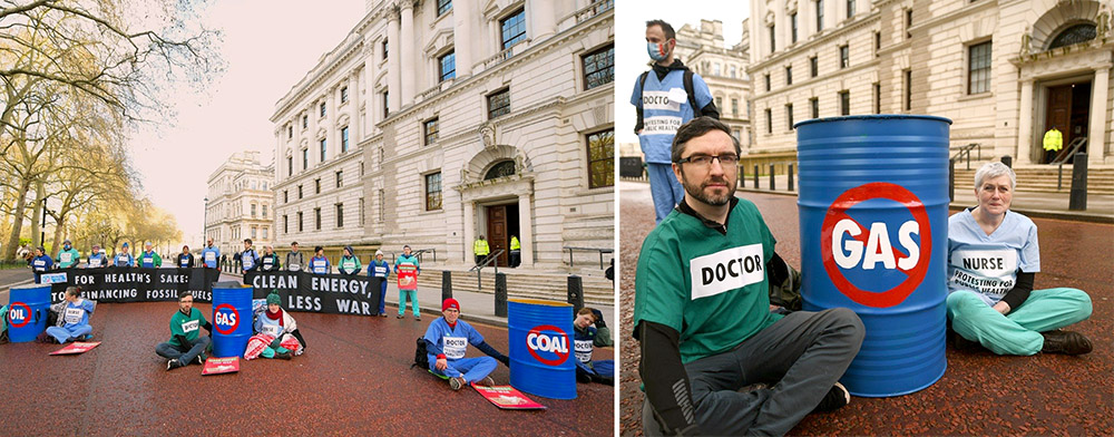 7 April | London, UK XR Doctors block Britain’s Treasury building on World Health Day, demanding an end to the UK Government’s financial support for fossil fuels.