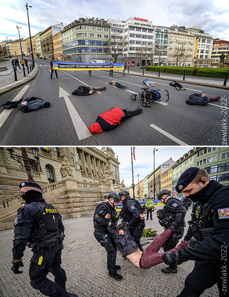 8 April | Prague, Czech Republic For the second week in a row, ‘3°C activists for Ukraine’ blocked roads in central Prague. In order to reduce Czech consumption of Russian gas, they want a maximum temperature imposed on gas heating of offices and buildings and a halt to all new gas investments. They were met with scenes of anger and shocking violence by motorists. Photos: Zewlakk