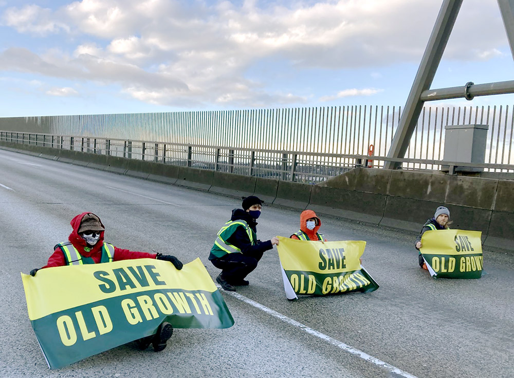 4 April | Vancouver, Canada Supporters of Save Old Growth return to block once again the Ironworkers Memorial Bridge in protest against the endless logging of ancient forests in British Columbia.