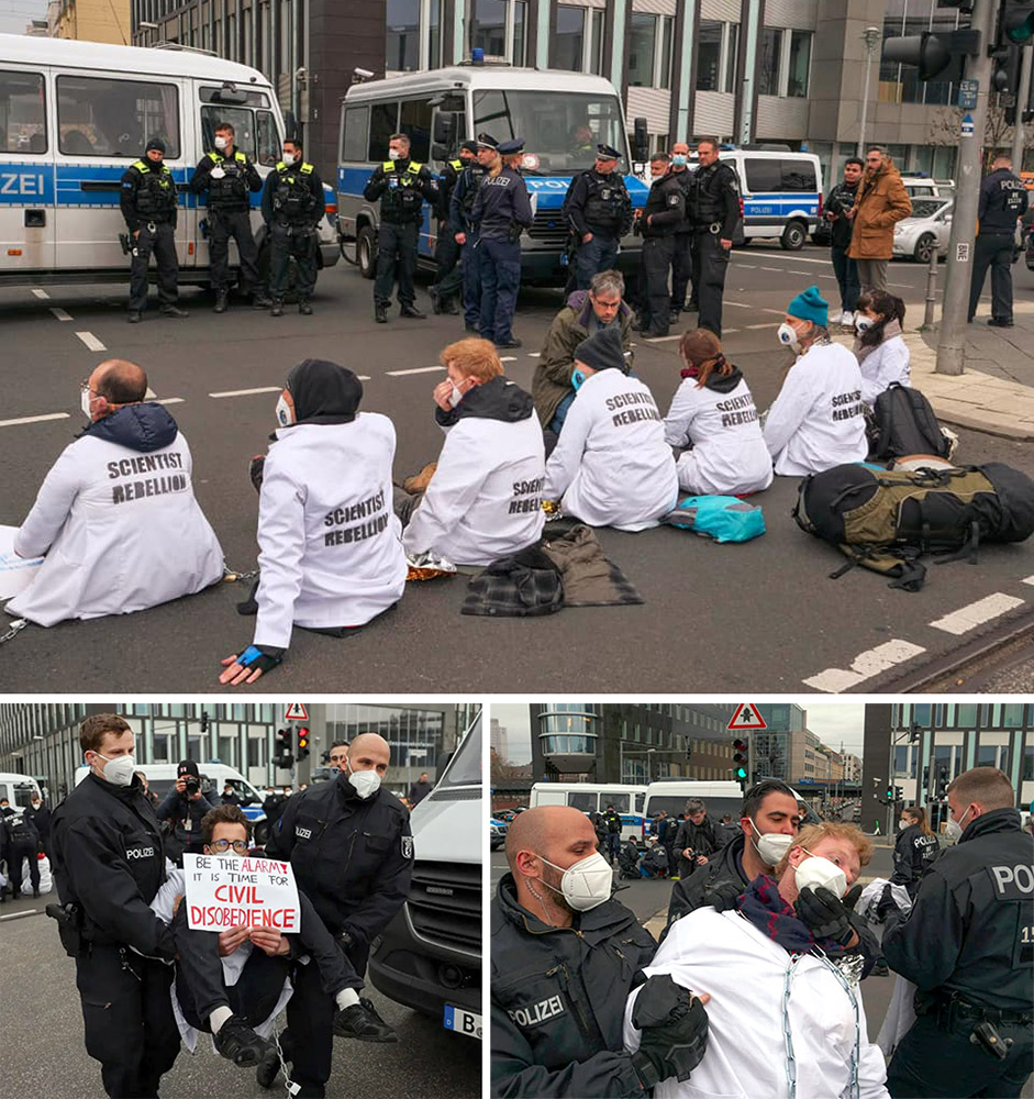 7 April | Berlin, Germany Scientists from across the republic blocked a bridge at the Reichstag for four hours, chained and glued together in an action of civil resistance against a policy that lies and is driving us all into climate hell.