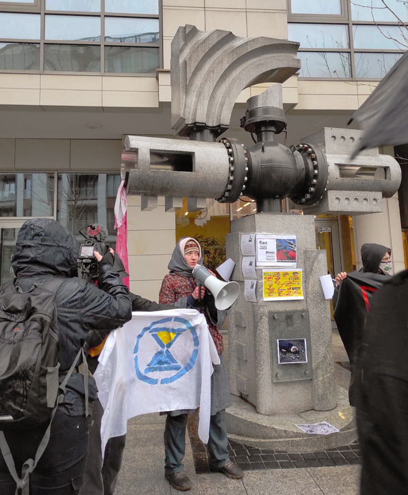 5 April | Western Ukraine Members of Extinction Rebellion Ukraine take action at offices of EuroGazPol, an affiliate of Russian energy giant Gazprom, near the Yamal-Europe pipeline monument. They were calling for countries to stop financing Russia’s war by buying Russian gas and oil.