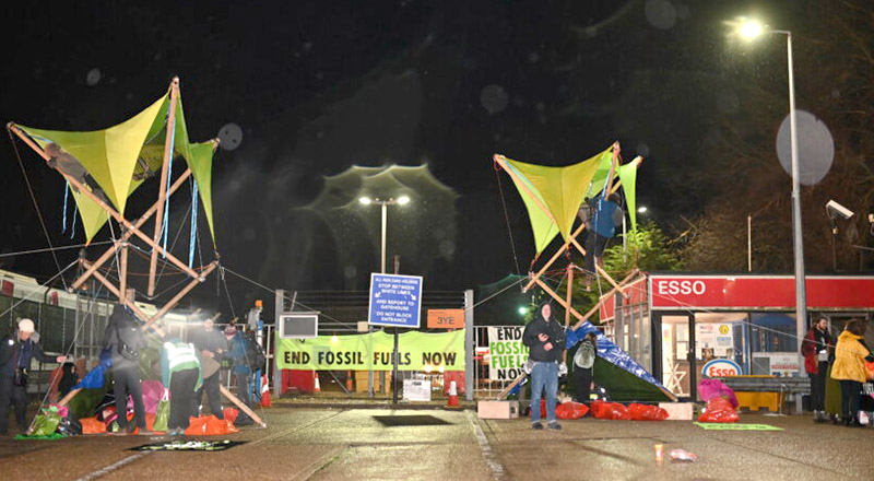 4 April | Heathrow, UK At 4am this morning, Extinction Rebellion returned to the Esso West London Oil Terminal near Heathrow Airport in London. They are currently blocking the entrance with 2 bamboo structures and around 30 people. This is the fourth day in a row in which oil facilities across the UK have been blocked as part of ongoing action by XR and the Just Stop Oil coalition.