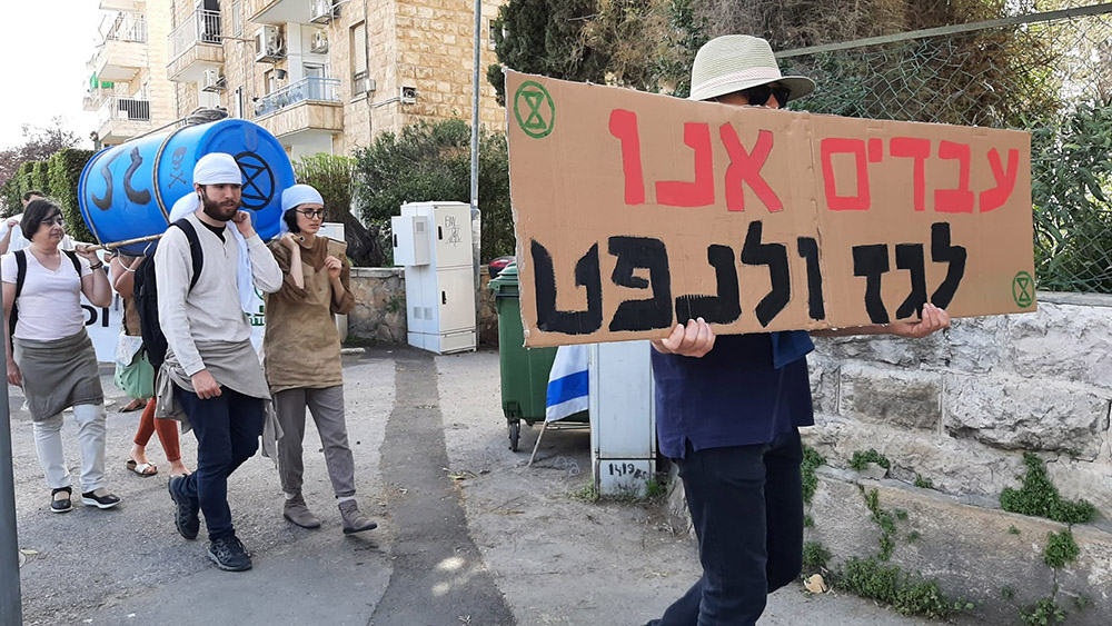 6 April | Jerusalem, Israel Rebels march on the Israeli prime minister’s office, some disguised as slaves and carrying a simulated barrel of oil with the message ‘We are slaves to gas and oil.’ In the recent IPCC report Israel is identified as part of a global ‘hot spot’ heating up faster than the rest of the world. Israeli rebels call the dangers facing Israel ‘the ten plagues of the climate crisis’: flood, famine, fire and heat waves, species extinctions, rising sea levels, war, drought, climate refugees, disease, and economic collapse.