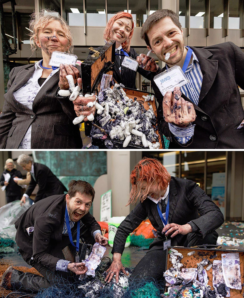 4 April | London, UK Ocean Rebellion activists were at the International Maritime Organisation (IMO) to highlight its continued support of the oil industry, dirty shipping, and plastics pollution. Suited ‘delegates’ released fake ‘plastic’ nurdle pellets at the entrance to the IMO Pollution Prevention and Response conference - nurdles coated in viscose pollutants that stuck to the ground and to delegates' feet. Photos: Crispin Hughes and João Daniel Pereira.