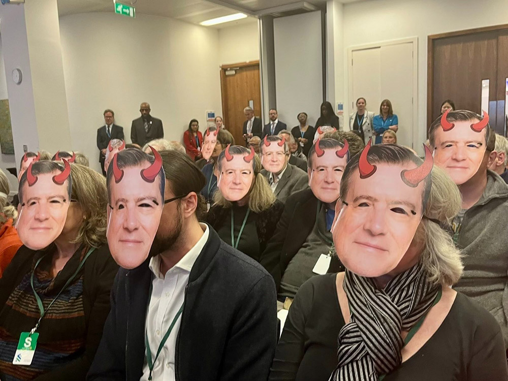4 May | London, UK Money Rebellion activists invaded the Annual General Meeting of Standard Chartered, the third worst UK-based bank for fossil fuel funding. Since 2016 it has increased funding for fracked oil and gas, offshore oil and gas, liquid natural gas, and coal. In an earlier action at HSBC’s Annual General Meeting, Money Rebellion sang a revised version of Abba’s famous song, “Money, money, money! It’s so scummy, in HSBC’s world”, much to the bank chairman’s annoyance.