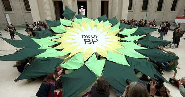 23 April | London, UK Hundreds of fossil fuel protesters took over the British Museum with a mass performance against its sponsorship by British oil giant BP. They smuggled in a giant Drop BP logo past security and didn't leave at closing time. Photo: Art Not Oil Coalition.