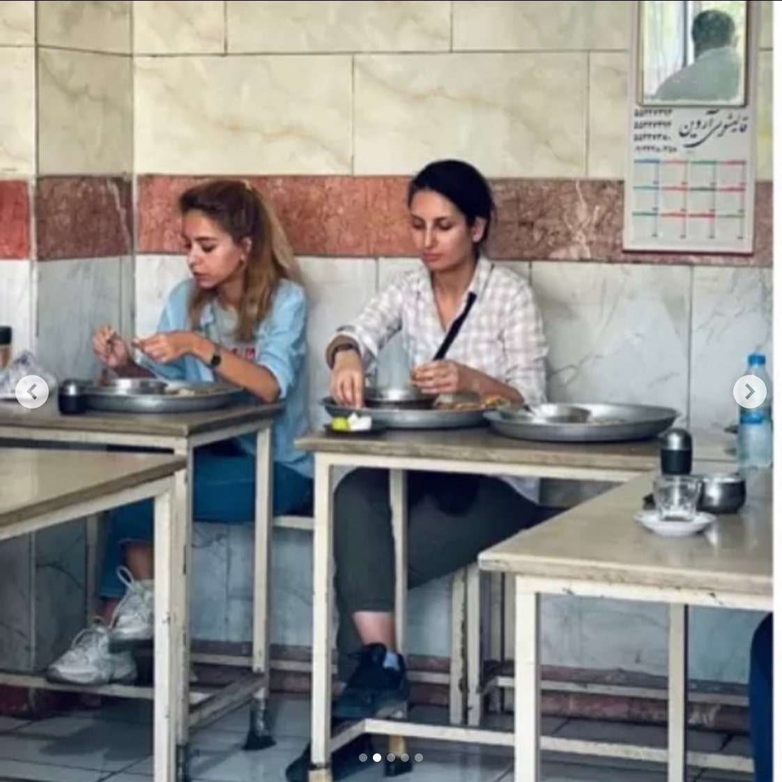 Two Iranian women defiantly eat in a restaurant with their heads uncovered. Photo: @discotehran.nyc