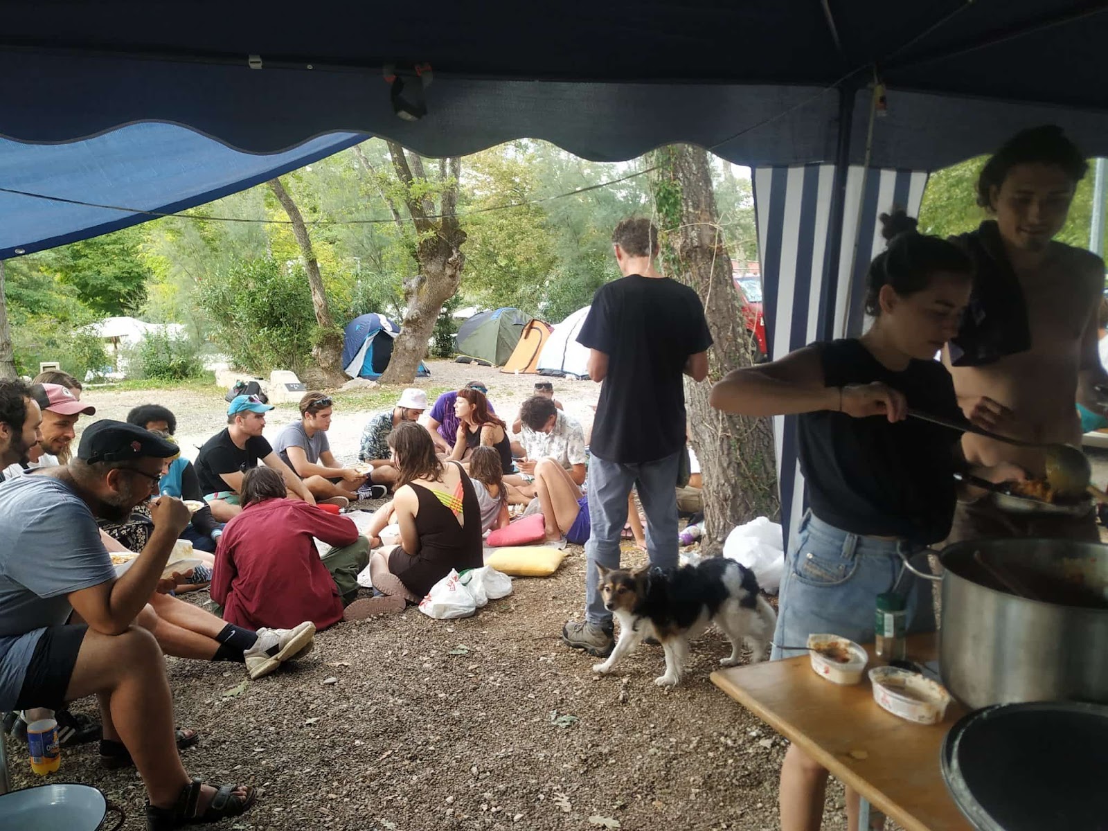 Rebels from France, Italy, Slovakia, Czech Republic, Ukraine, Russia, Austria, Germany, Lithuania, UK and the US settle down for a climate camp lunch.