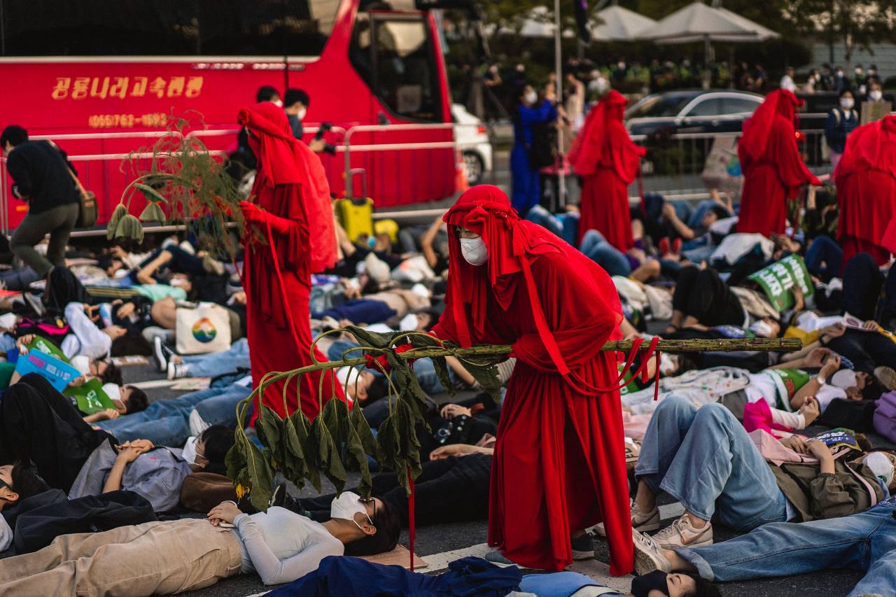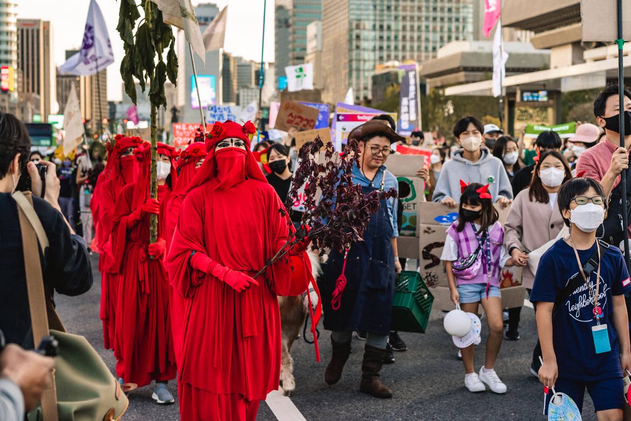 The Red Brigade appears at a huge Climate Strike march in Seoul, South Korea. Photo: Juho Kim