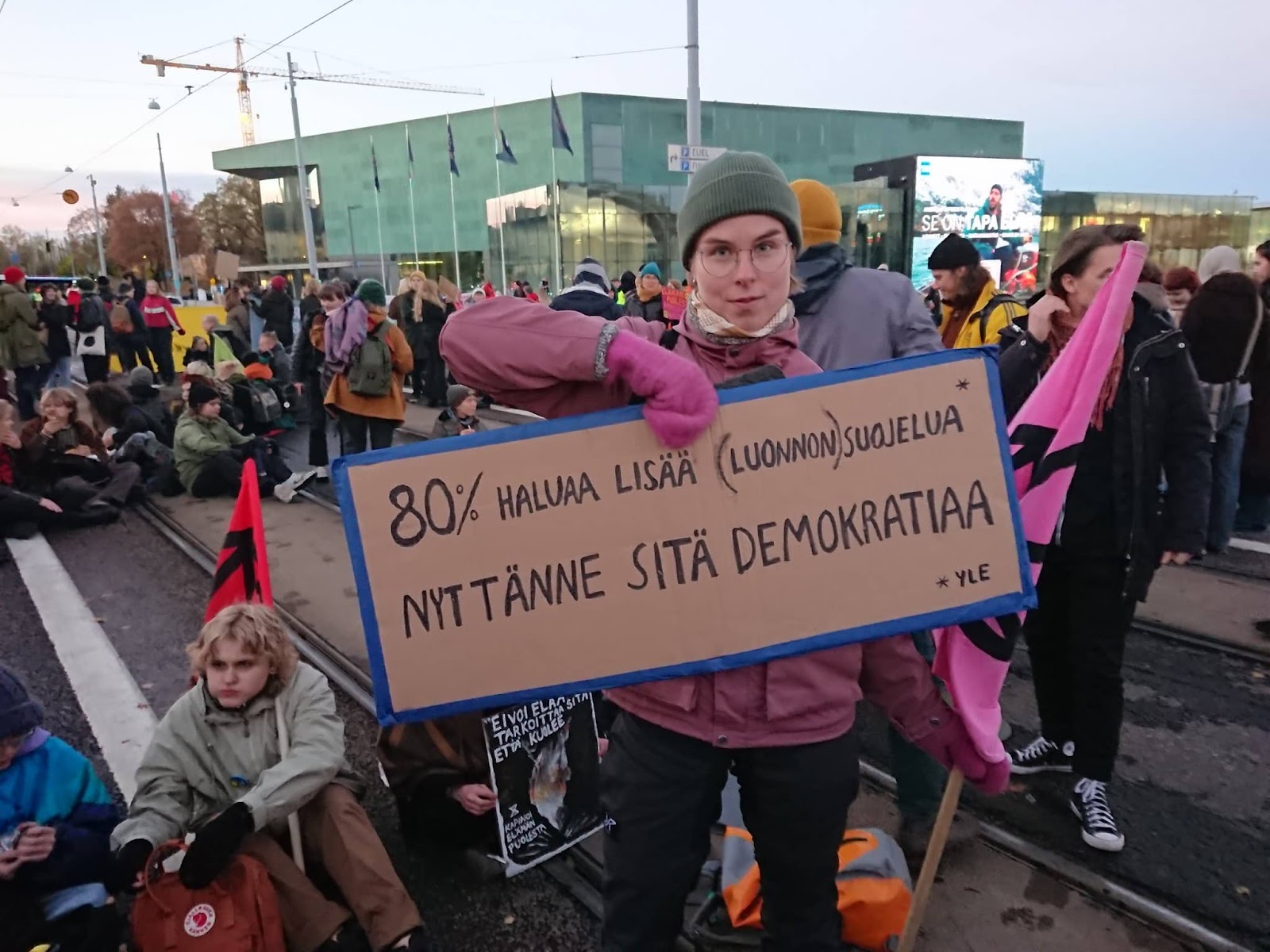 Finnish rebels are occupying their capital right now as part of their Rebellion For Nature. Expect a full report in the next issue. Sign: ‘80% want more nature protection. Now that’s democracy.’