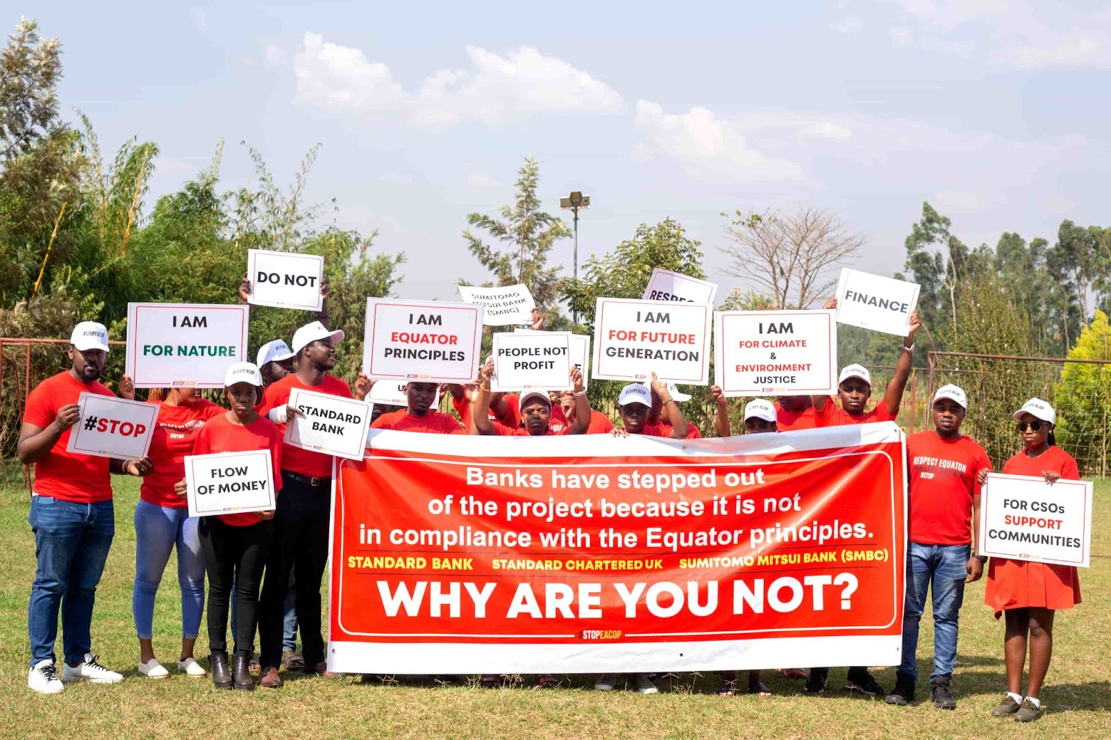 In Johannesburg, South Africa, protestors brandished banners and placards outside Standard Bank, while in Tokyo, Japan activists congregated in blood-red jumpsuits at Sumitomo Mitsui Banking Corporation (SMBC).