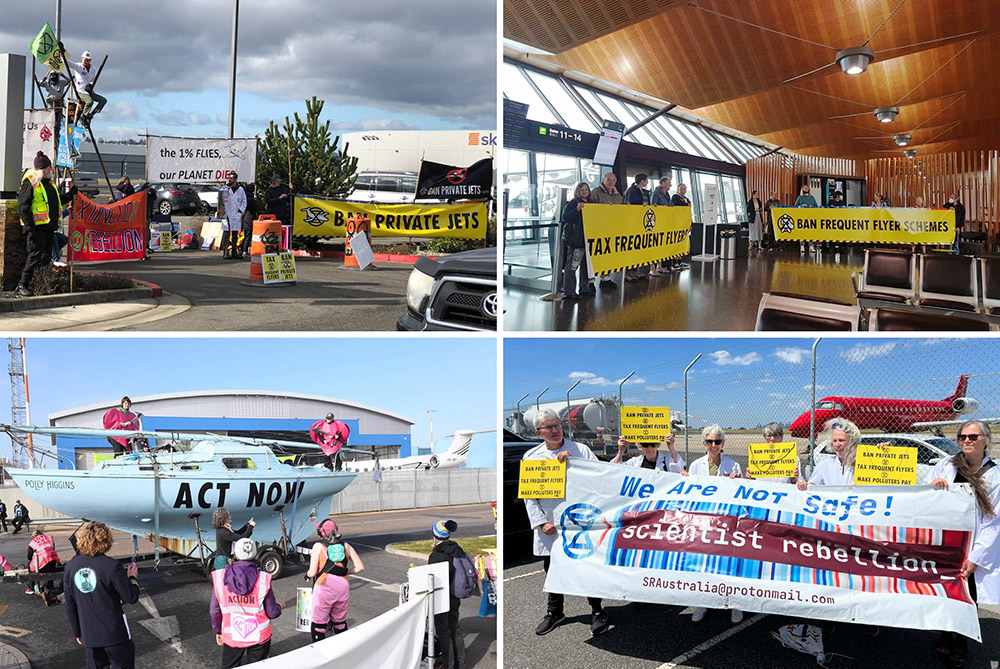 Blockades at private airfields in (clockwise from top left) Seattle, USA, Christchurch, New Zealand, Melbourne, Australia, and Luton, UK.
