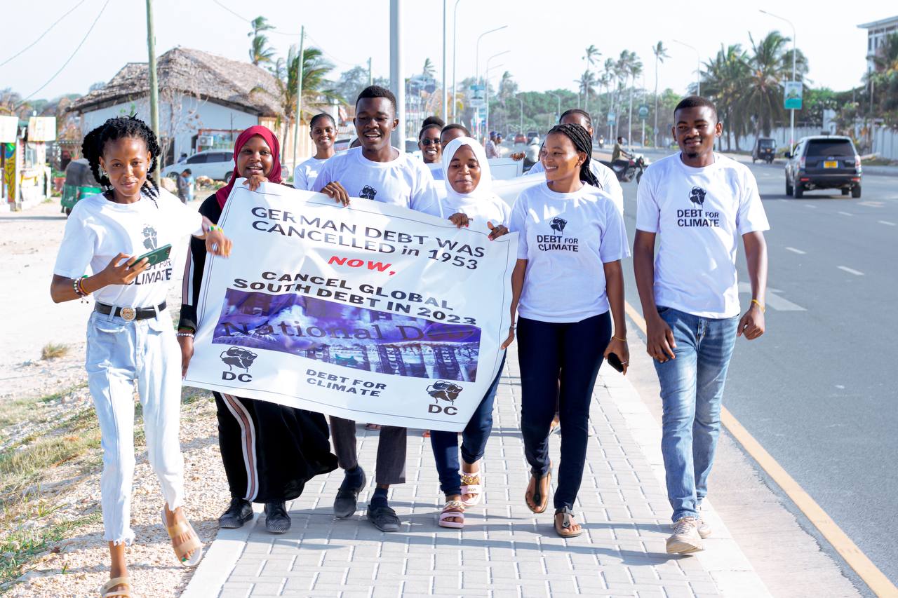 Debt For Climate Tanzania march through Dar es Salaam calling for the Global South to get the same debt cancellation that Germany received after WWII.