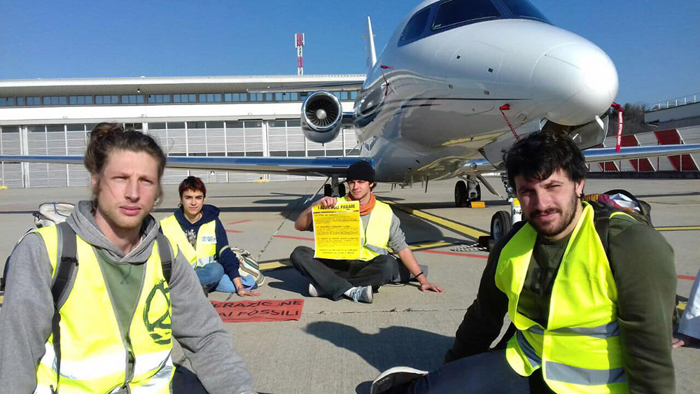 Rebels glue themselves to a private jet runway in Milan, Italy.