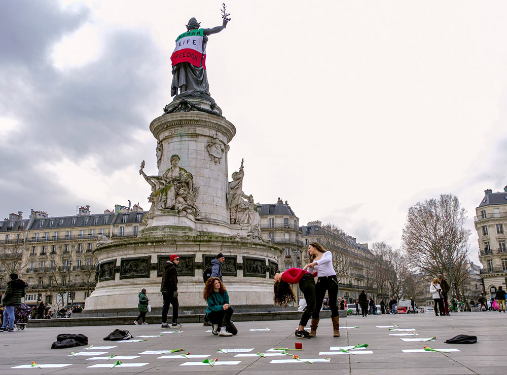 10 FEB | Paris, France: Rebels supporting mass civil disobedience in Iran draped the Place de la République statue with a huge Iranian flag and danced in solidarity the day before global demonstrations against the Iranian regime. But the flag, inscribed with the motto of the civil resistance (Woman Life Freedom) was removed by police after just half an hour. Last year, a Ukrainian flag was left there by authorities for weeks.
