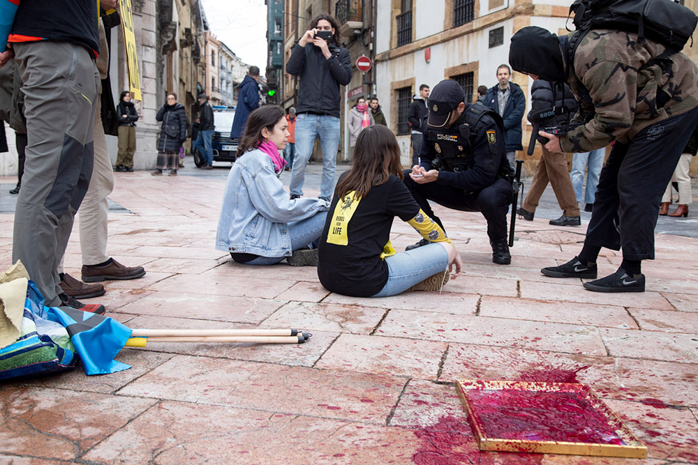 26 FEB | Oviedo, Spain: Two young rebels run out of the Museum of Fine Arts with a painting in their arms, pursued by alarmed security personnel. Outside, the activists trample the picture, break its glass, stain it with red ink, shouting ‘No art on a dead planet’ and ‘Don't look at us, join us.’ The police are called. The action is a set-up. No painting has been stolen from the museum. ‘We didn't want to do this,’ the rebels said, ‘but we need your attention.’