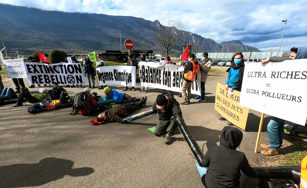 20 MAR | Chambery, France: Rebels and other activists blockaded the entrance to the Savoie-Mont-Blanc airport in protest against private jets.