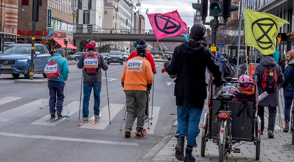 12 MAR | Stockholm, Sweden: Rebels staged a snow-free ski race through the streets of Stockholm to highlight the latest measure of carbon dioxide in the atmosphere: 419 parts per million (ppm) - and to protest the lies of Preem, Sweden’s largest fuel company and "proud main sponsor” of the Vasaloppet, the world’s biggest cross-country ski race. Preem says it is moving towards a “more sustainable future”, when in fact it is continuing with the same large-scale production of fuel.