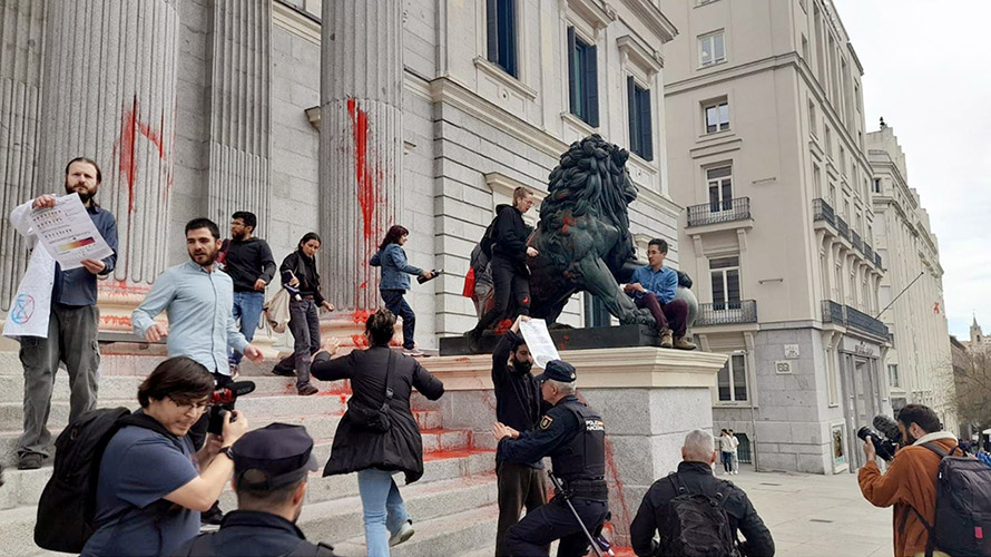30 MAR | Madrid, Spain: Rebels stained the Congress of Deputies with fake blood on the day 15 activists from Scientist Rebellion began their trial for doing the same action nearly a year earlier. They face terrorist charges that could lead to 8.5 years in prison!