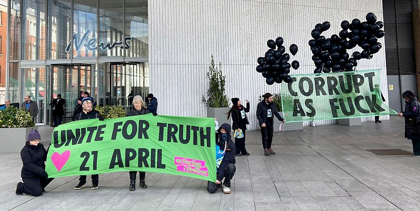 22 MAR | London, UK: Rebels spray-painted the offices of various tabloid newspapers to call out their suppression of the climate crisis. Balloons helped a large banner with the words ‘CORRUPT AS FUCK’ float up to the executive floor of Rupert Murdoch’s News UK offices.