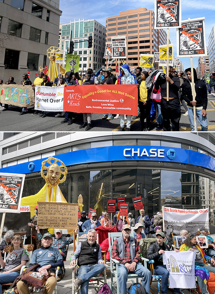 21 MAR | USA: A large alliance of eco groups including XR rallied outside fossil fuel funding banks across the country. In DC, elders blockaded four banks with rocking chairs. In Seattle, Elders climbed ladders to blockade the front doors of Chase bank.