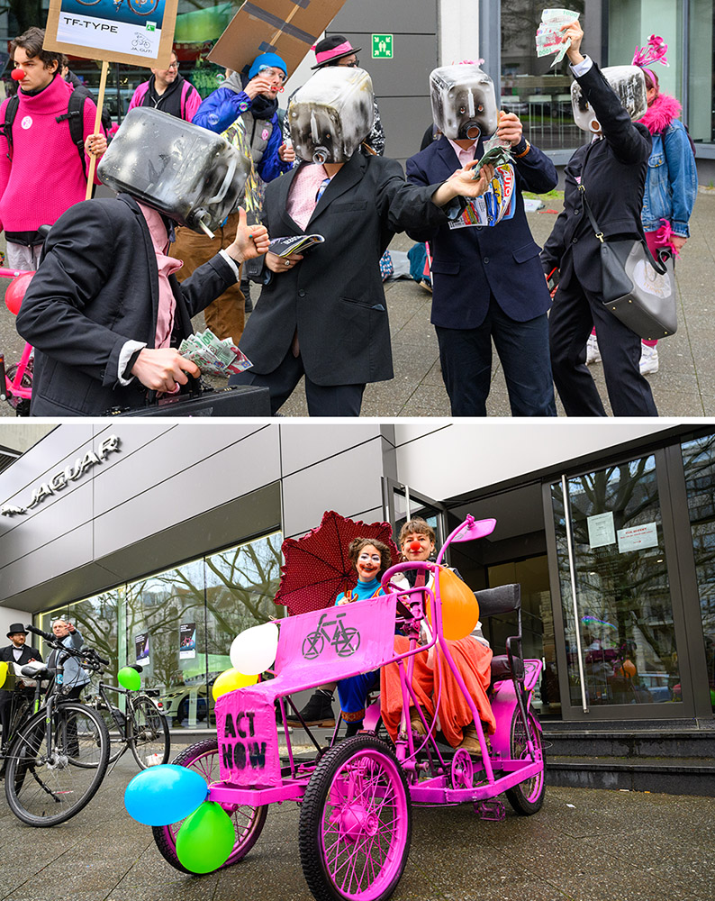1 APR | Berlin, Germany: For April Fools 30 rebels, some dressed as petrol-heads, put on a bike show in front of a luxury car dealership selling Jaguar and Land Rover fossil fuel vehicles. The activists suggested that the car dealer should introduce a new line of zero-emission vehicles in the form of bicycles. Photos: Stefan Mueller
