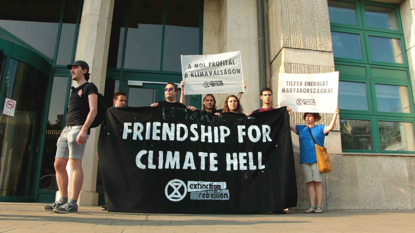 Budapest: Rebels protest outside the Ministry of Foreign Affairs. The signs say ‘MOL profits from the climate crisis’ and ‘Clean energy for Hungary!’. MOL is the Hungarian oil company building the pipeline.