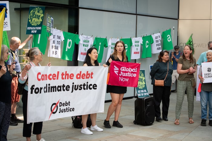 A rebel coalition including activists from Debt For Climate, Global Justice Now, and Debt Justice held a rally outside the offices of the IPIECA, the organisation used by Big Oil corporations to influence and ultimately sabotage COP climate negotiations.