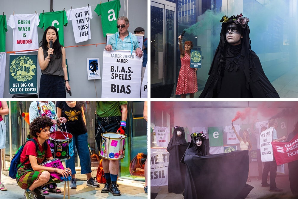 Undeterred, the rebels put on a disruptive display, calling out the IPIECA for its gross greenwashing, and demanding that COP28 be freed from Big Oil influence. There were stirring speeches and an imposing display by the XR Oil Slickers.