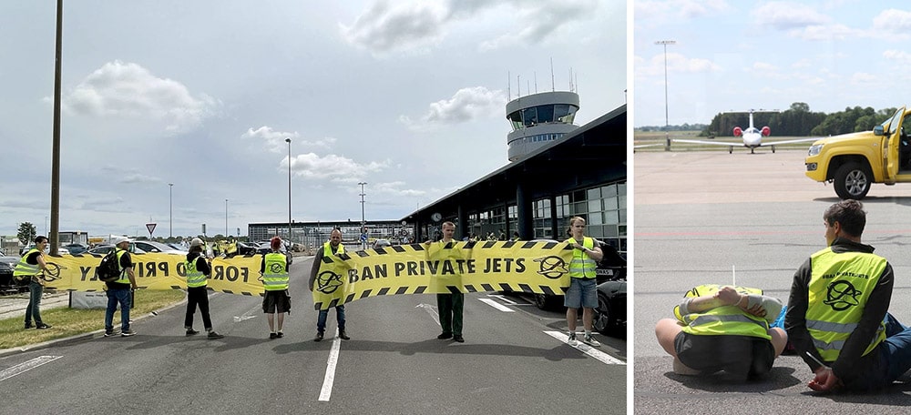 30 JUNE | Roskilde, Denmark: 45 rebel activists & scientists disrupt Roskilde airport, where private jet flights have quadrupled since 2020. Those on the runway were arrested and charged according to a repressive criminal law that could lead to 6 years in jail. Meanwhile, the super-rich enjoy their criminal luxury.