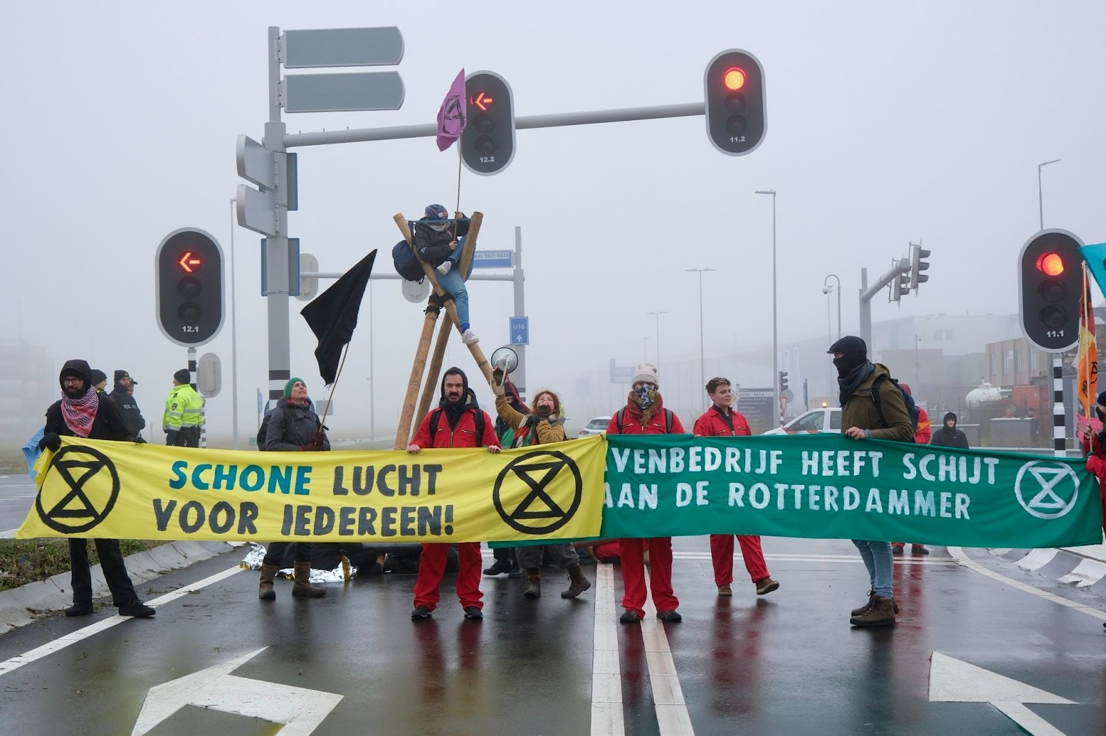 8 DEC | Rotterdam, Netherlands: 130 rebels block the main access roads to the Europoort, the most polluting port in Europe. After hours of disruption, the Mayor of Rotterdam invited XR for talks about making the port more sustainable. During the meeting, the Mayor acknowledged the port had a major pollution problem and a green transition was necessary, but promised only to discuss the matter further with the company running the port.