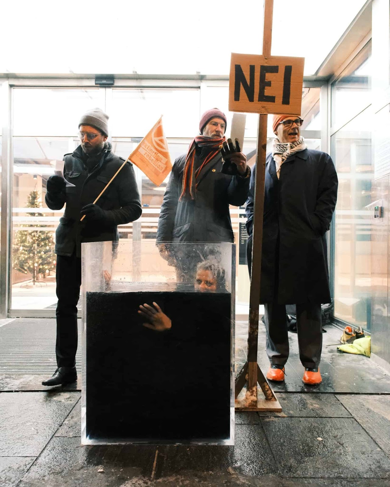 12 DEC | Oslo, Norway: Rebels shut down the headquarters of Norway’s largest trade union group for its support of the oil industry and failure to offer its workers jobs in a green transition. The blockade forced arriving union employees to face people “drowning” in oil and either support or reject further oil exploration. The government recently banned deforestation, though is still happy for its oil industry to commit ecocide beyond its own boundaries.